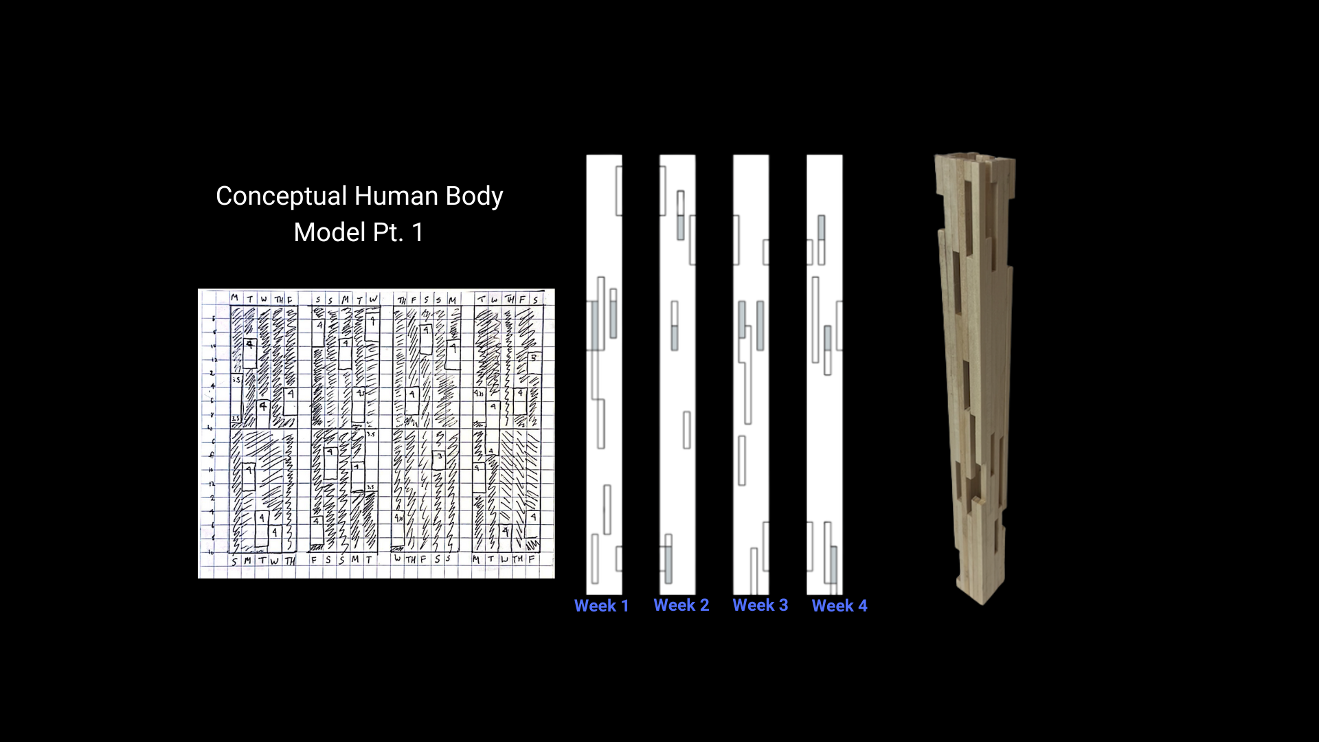 This project began with a core, which illustrates an abstract design that incorporates data pertaining to the human body. I chose to incorporate my own human body by measuring the amount of time I spent working in a one-month period. I then used that data to generate form language.